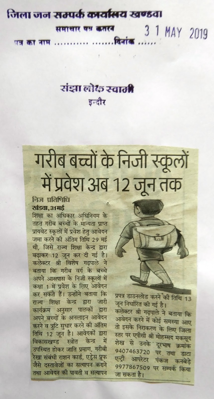 खण्डवा 31 मई, 2019 - गत वर्ष तक सरकारी स्कूलों के नाममात्र के कुछ बच्चे ही नवोदय विद्यालय प्रवेश परीक्षा के माध्यम से चयनित हो पाते थे। गत 1 वर्ष में कलेक्टर श्री विशेष गढ़पाले के विशेष प्रयास के कारण इस वर्ष जिले के सरकारी स्कूलों के कुल 21 बच्चे नवोदय विद्यालय पंधाना में कक्षा 6 में प्रवेश के लिए चयनित हुए है। कलेक्टर श्री गढ़पाले ने इन सभी बच्चों एवं उनके पालकों को इस सफलता के लिए शुभकामनाएं दी है। जिला शिक्षा केन्द्र खण्डवा के जिला परियोजना समन्वयक श्री नीलेश रघुवंशी ने बताया कि गत 1 वर्ष से कलेक्टर श्री गढ़पाले के निर्देश पर सरकारी स्कूलों में नवोदय प्रवेश परीक्षा के लिए बच्चों को विशेष कोचिंग दी जा रही थी, जिसके परिणाम स्वरूप यह उल्लेखनीय परिणाम सामने आये है। उन्होंने बताया कि जो विद्यार्थी नवोदय विद्यालय में प्रवेश के लिए चयनित हुए है, उनमें हरसूद विकासखण्ड के ग्राम चारखेड़ा के शासकीय प्राथमिक विद्यालय श्री बंटी, खालवा विकासखण्ड के ग्राम पटाजन के शासकीय प्राथमिक विद्यालय की आयुषी मिश्रा व दिव्यांशी जैन, मामाढोह के शासकीय प्राथमिक विद्यालय के योगेश, मेढ़ापानी के शासकीय प्राथमिक विद्यालय के विक्रम, गोलखेडा के शासकीय प्राथमिक विद्यालय के नीलेश कास्डे चयनित हुए है।